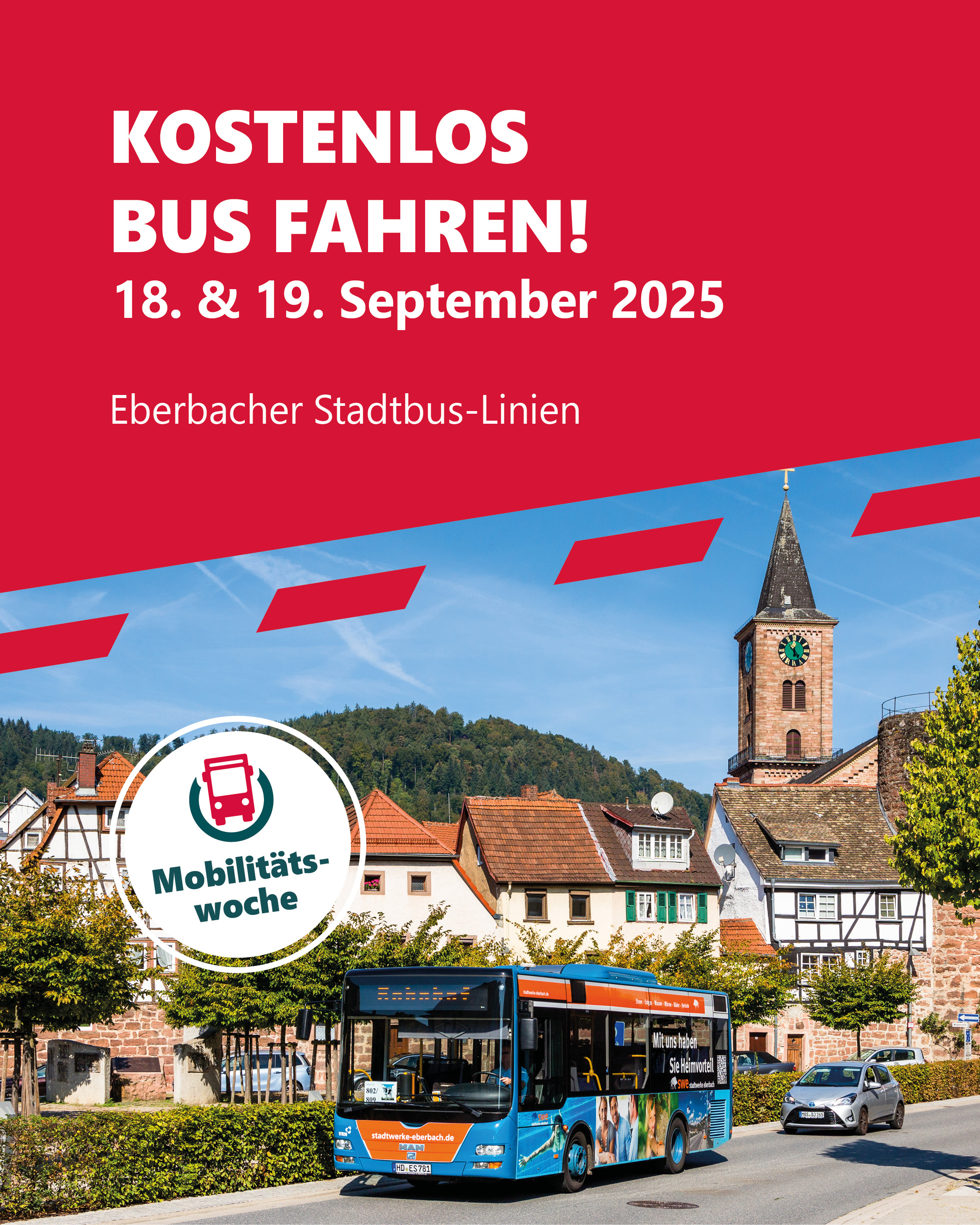 Am 18. und 19. September 2025 können Sie im Rahmen der Europäischen Mobilitätswoche alle Eberbacher Stadtbus-Linien (801–808) kostenfrei nutzen – von Betriebsbeginn bis Betriebsende.