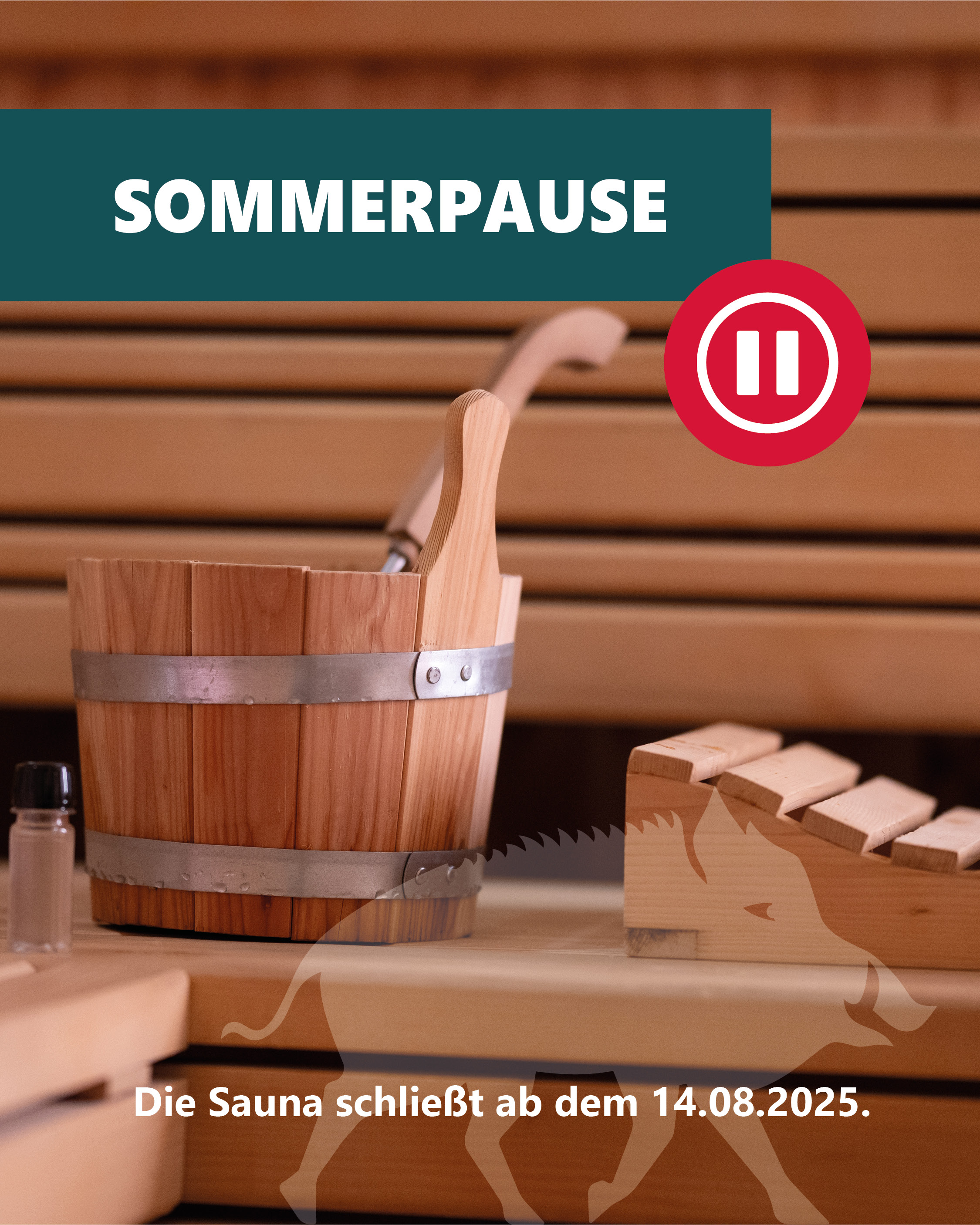 Ab dem 14.08.2025 bleibt unsere Sauna vorübergehend geschlossen – sie öffnet wieder, sobald auch das Hallenbad nach der Sommerpause in Betrieb geht.